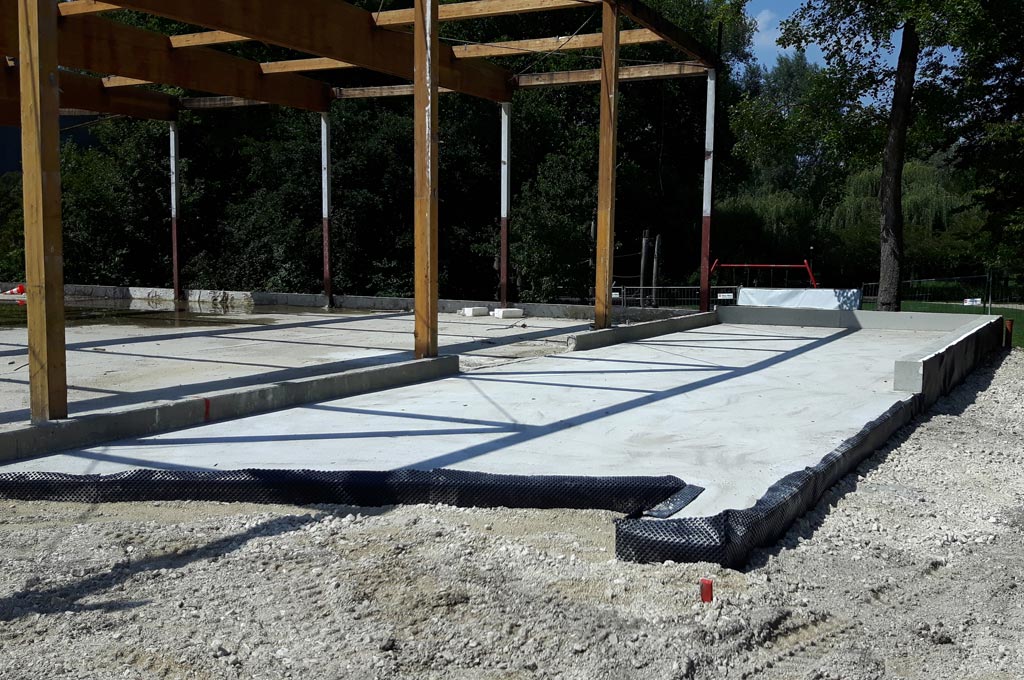 Das Fundament und die Bodenplatte des Foyer-Anbaus sind fertig. Nun können die Wände aufgerichtet werden.
