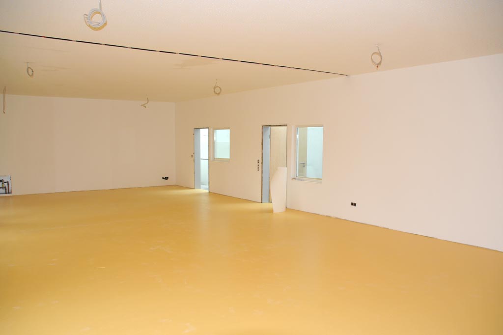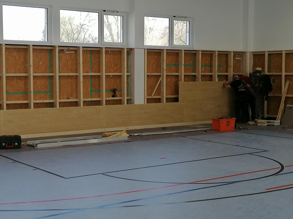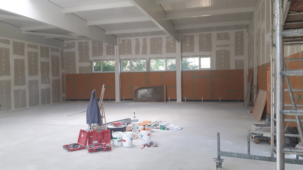 Der Innenausbau kommt voran. Die Wände werden verkleidet und an die Decken kommen Akustik-Elemente. Mehr Bilder dazu in unserer Fotogalerie.