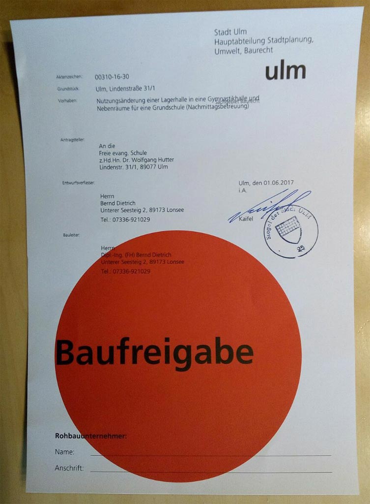 Das Baugesuch ist genehmigt. Nun muss die Statik gemacht werden, damit die Baufreigabe erfolgen kann.